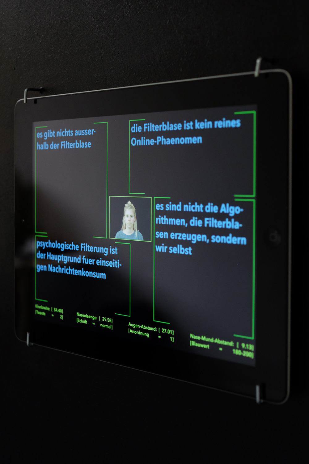 Anspruch dieser Masterabschlussarbeit aus dem Kommunikationsdesign ist es, ein Bewusstsein für personalisierende Algorithmen im Internet zu schaffen. Der unsichtbare digitale Filterprozess wird analysiert und durch die Gestaltung eines installativen Raumes sichtbar gemacht. Das Projekt will die Effekte von vorsortierten Informationen erfahrbar machen und Aufschluss über die Funktionsweise personalisierender Algorithmen geben. Sarah Klingenberg hat es sich damit zur Aufgabe gemacht, komplexe Fragestellungen des aktuellen Lebens als Gestalterin zu adressieren, abstrakte Themen durch Prototypen und Modelle zu visualisieren, um neue Perspektiven einzunehmen und Diskussionen anzustoßen. Insbesondere bei der Entwicklung von Algorithmen und der Gestaltung von digitalen Anwendungen, die von vielen Menschen konsumiert werden, sollten sich Designerinnen und Designer – so die Worte von Klingenberg selber – über Ausmaß und Potenzial ihrer Tätigkeit bewusst sein und sich solchen gesellschaftlich relevanten Bereichen gezielt zuwenden. Die Jury war überzeugt vom Ansatz dieser Arbeit durch sinnliches Gestalten Verstehensprozesse anzuregen. Aber auch der experimentelle, analysierende und reflektierende Gestaltungsprozess, der es nicht scheut, sich auf fremden Terrains wie der Programmierung zu bewegen, wird von der Jury hervorgehoben. Diese Masterarbeit stellt sich der Herausforderung, die eigene Kompetenz, Zuständigkeit und Aufgabe als Gestalterin zu erweitern, weil es ihr darum geht, sich aktuellen und dringlichen Themen zu widmen.